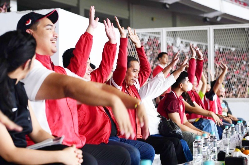 Presiden Jokowi didampingi oleh Ibu Iriana Joko Widodo, Menteri Pemuda dan Olahraga (Menpora) Dito Ariotedjo, Menteri Investasi /Kepala Badan Koordinasi Penanaman Modal (BKPM) Bahlil Lahadalia, Panglima TNI Laksamana Yudo Margono, Kapolri Jenderal Listyo Sigit Prabowo, dan Ketua Umum (Ketum) Persatuan Sepak Bola Seluruh Indonesia (PSSI) Erick Thohir saat menyaksikan pertandingan tersebut. (un/sng)