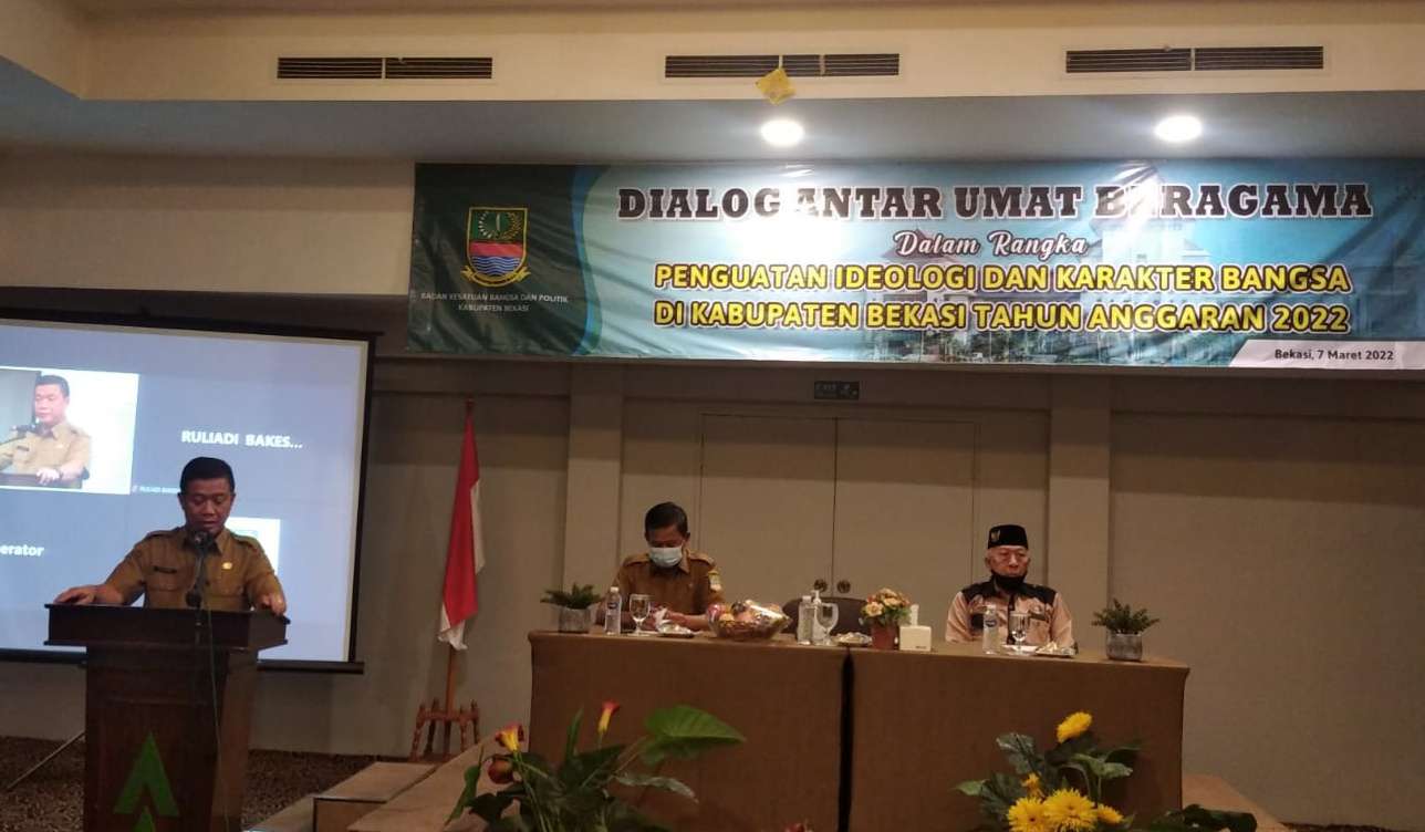 SUARAPENA.COM – Badan Kesatuan Bangsa dan Politik (Kesbangpol) Kabupaten Bekasi menggelar kegiatan dialog antar umat beragama tahun 2022, di Hotel Grand Cikarang Jababeka Cikarang Utara, pada Senin, (07/03/22).