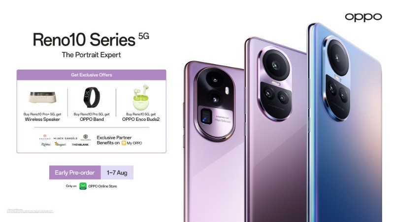 Konsumen pertama akan mendapatkan keuntungan ekstra selama masa Early Pre-order berupa Wireless Speaker untuk pembelian Reno10 Pro+ 5G, OPPO Band untuk pembelian Reno10 Pro 5G, OPPO Enco Buds2 untuk pembelian Reno10 5G dan berbagai keuntungan eksklusif di My OPPO.