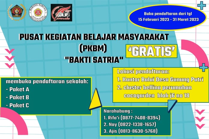Kali ini dua organisasi di Bogor Timur ini menggandeng Karang Taruna Desa Gunung Putri l, Kecamatan Gunung Putri yang bekerja sama dengan PKBM Bakti Satria melaksakan kegiatan kejar paket A, B, dan C secara gratis.