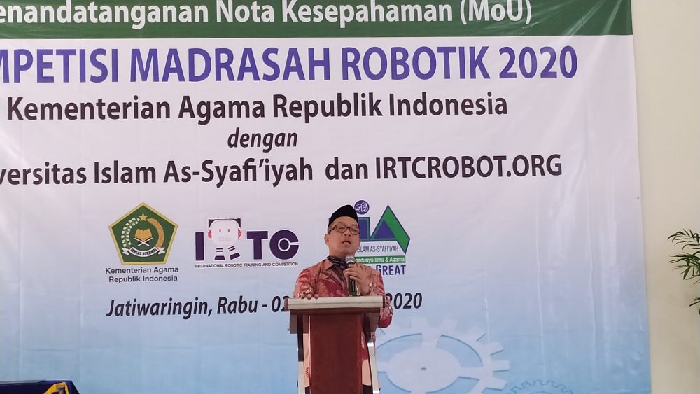 SUARAPENA.COM – Kementerian Agama Republik Indonesia (Kemenag RI) lakukan penandatanganan Memorandum of Understanding (MoU) Kompetisi Robotik Madrasah 2020 bersama Universitas Islam As-Syafi’iyah (UIA) dan International Robotic Training and Competition (IRTC) irtcrobot.org . Penandatangan MoU tersebut dilakukan di Kampus II UIA, Jatiwaringin, Kota Bekasi, Jawa Barat, Rabu (2/9/2020).